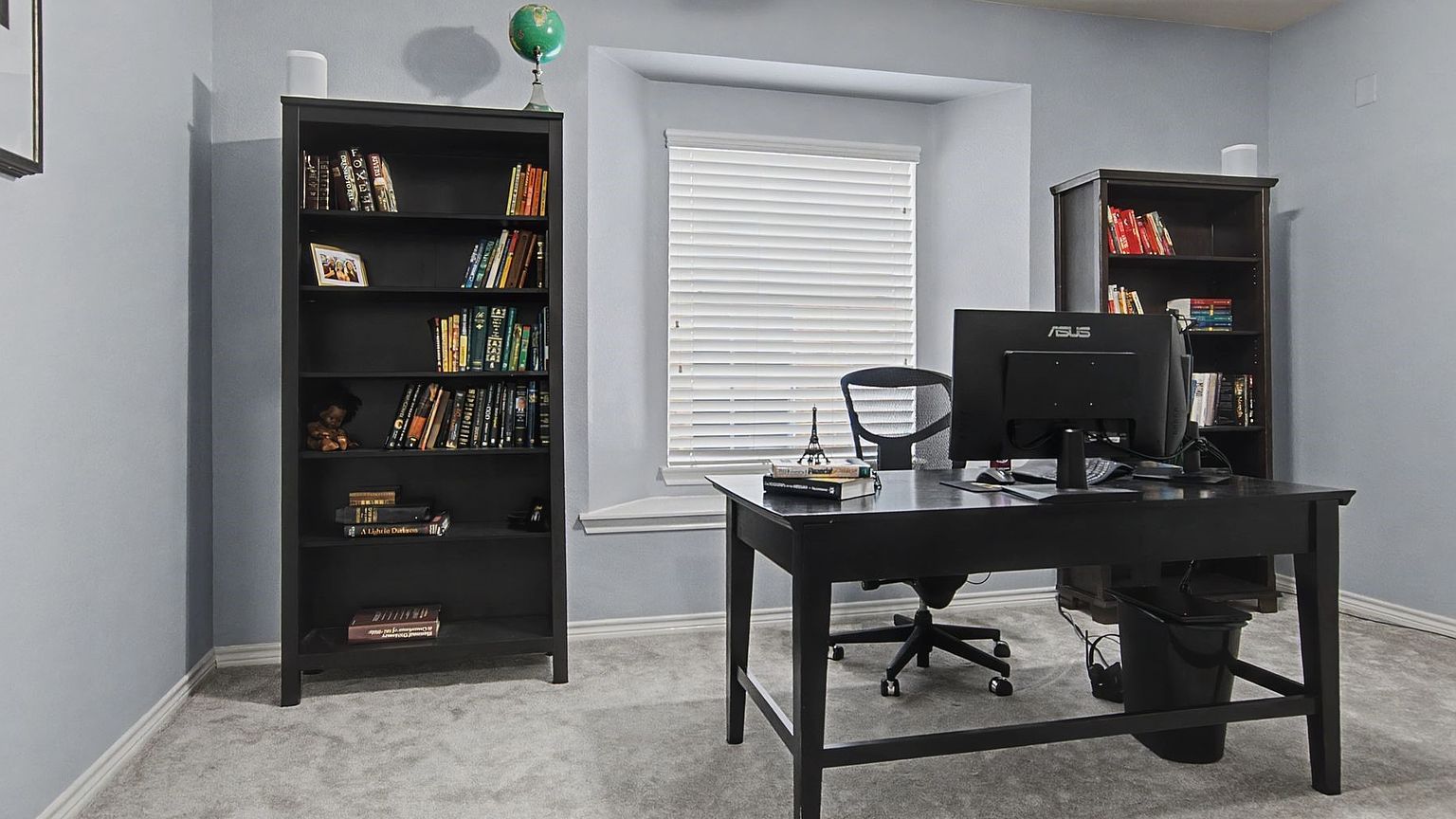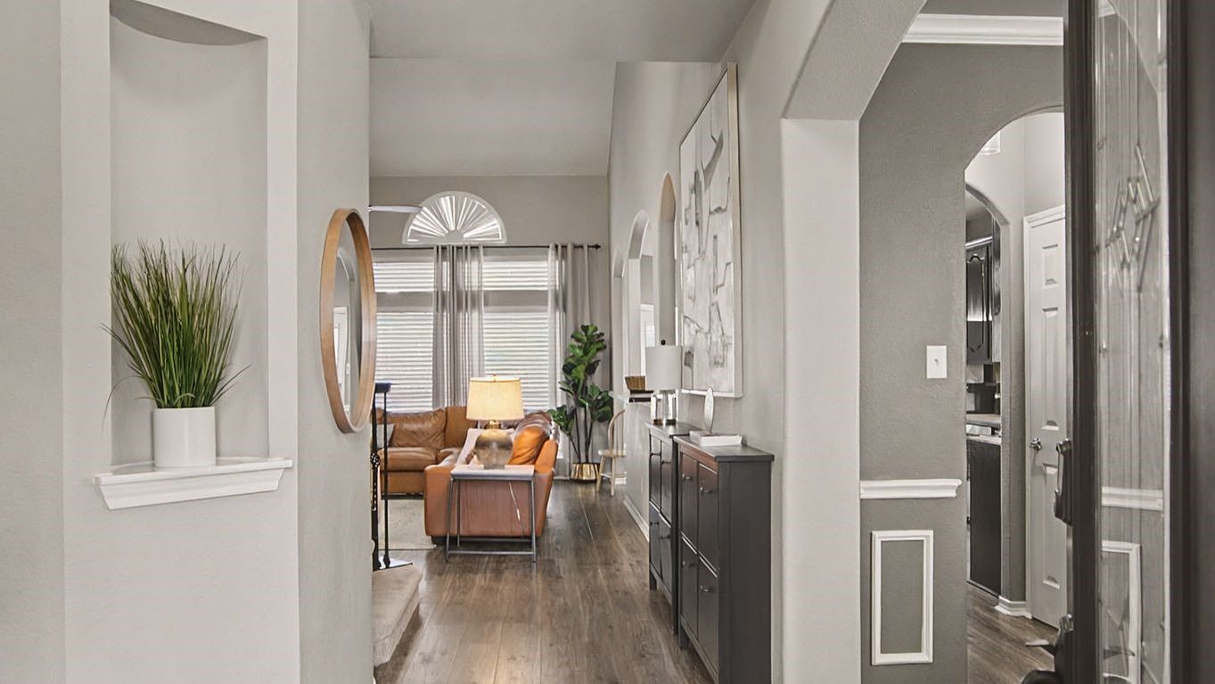 This striking galley-style kitchen marries dramatic black cabinetry with warm wood-look flooring, creating an elegant workspace that flows seamlessly into your dining area. Generous prep space, stainless steel appliances, and soaring ceilings crowned with graceful archways make every culinary endeavor a pleasure, while the open design keeps you connected to family and friends.